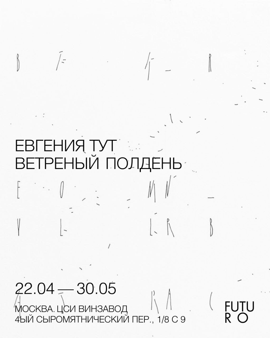 Галерея Futuro представляет персональную выставку междисциплинарной художницы Евгении Тут «Ветреный полдень», в которой она продолжает разрабатывать две основные темы своего интереса — письмо и архитектуру. На выставке представлены графические работы, образующие инсталляционный диалог с пространством галереи.